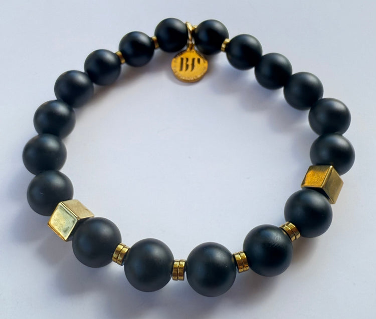Crafted with matte onyx for grounding and energetic protection, tiger eye for courage and decisive action, blue/turquoise crystals for clear communication and inner calm, gold hematite for mental strength and resilience, and finished with stainless steel gold to represent success and refined masculine presence.