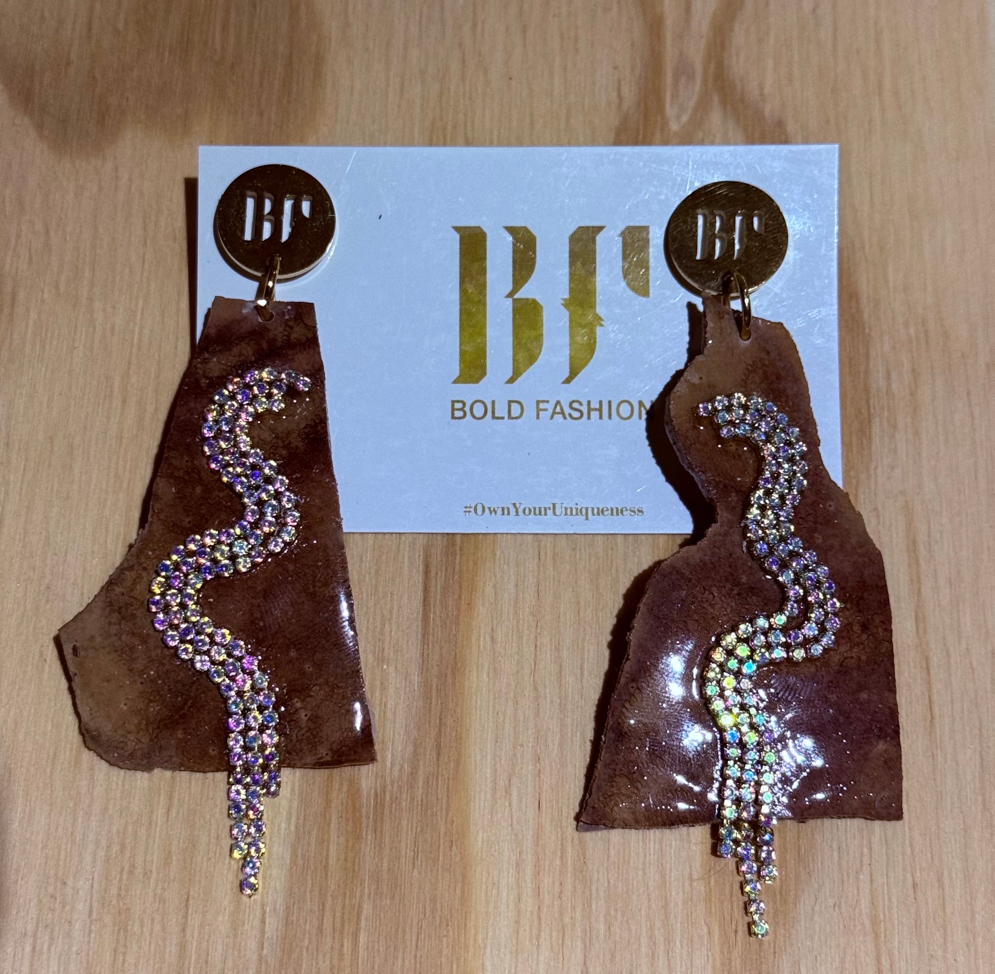 A glowing presence you can wear. Aura features a unique rhinestone chain design that dances across the calabash surface, creating a subtle yet magnetic shimmer. These earrings amplify your natural energy and elevate any outfit with pure brilliance.