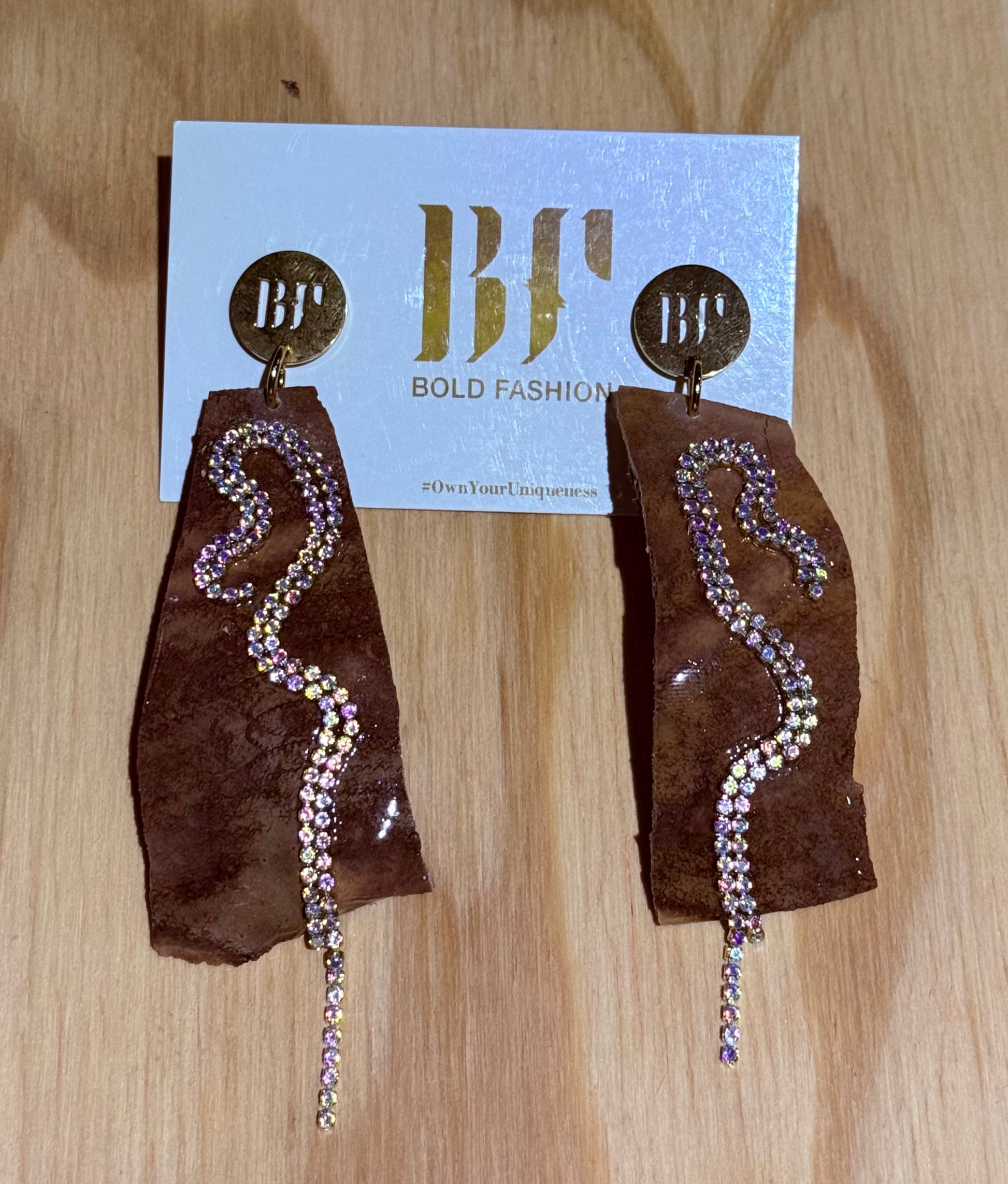 A glowing presence you can wear. Aura features a unique rhinestone chain design that dances across the calabash surface, creating a subtle yet magnetic shimmer. These earrings amplify your natural energy and elevate any outfit with pure brilliance.