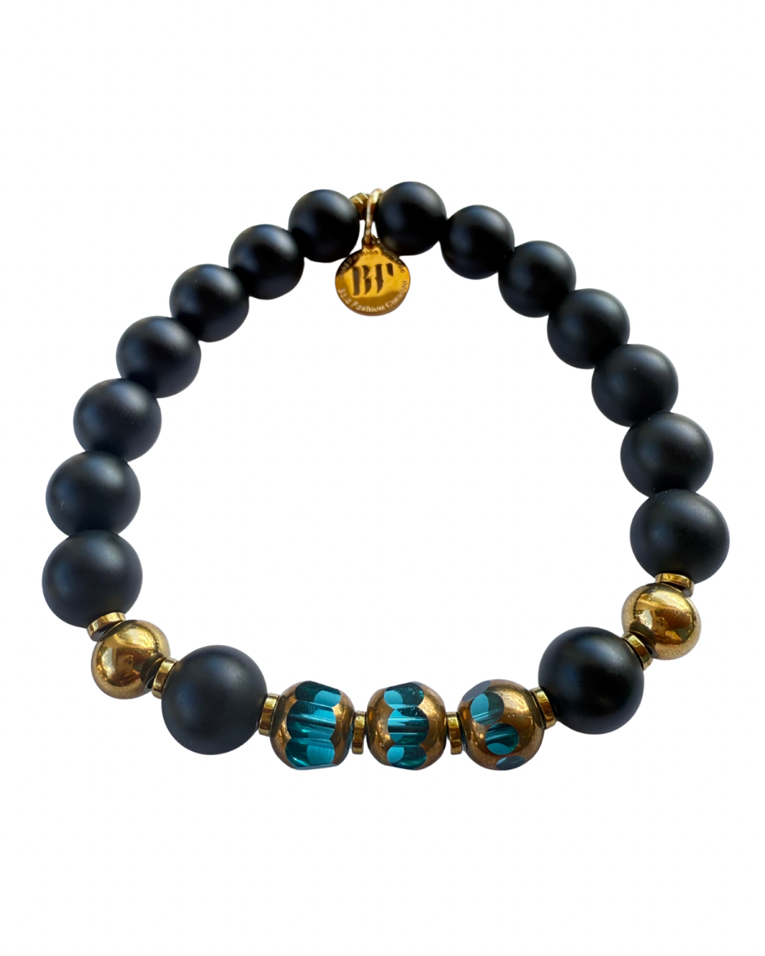 For the man who stays calm, centered, and emotionally balanced. Matte Onyx provides stability and strength, while blue/turquoise crystals support inner peace and honest expression. Finished with stainless steel gold for steady growth and resilience.