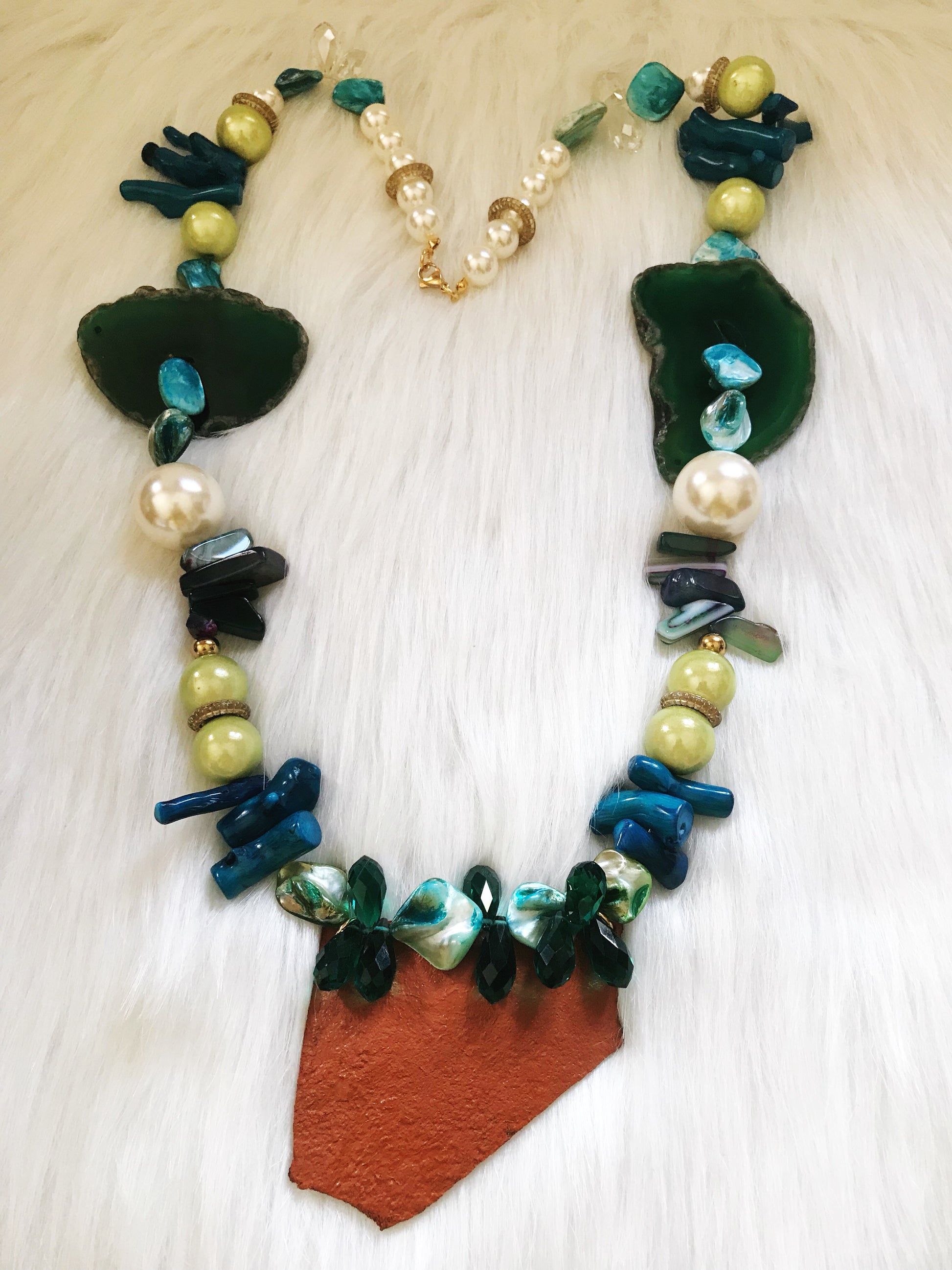 Agate is the biggest green stones in the necklace and are known as a stone of inner guidance, protection, and healing. Many ancient cultures used it to protect against negative energies and to combat worry.